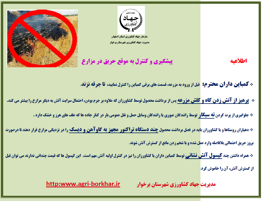 زارعین گرامی: ببرای کسب اطلاعات بیشتر در خصوص حریق و پآتش زدن در اراضی زراعی، اطلاعیه پیوست توجه فرمایید ...